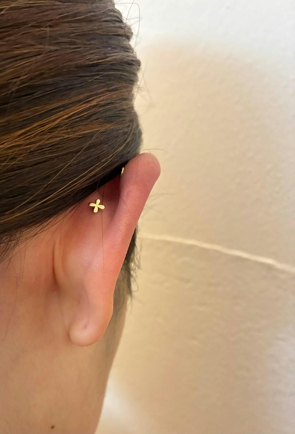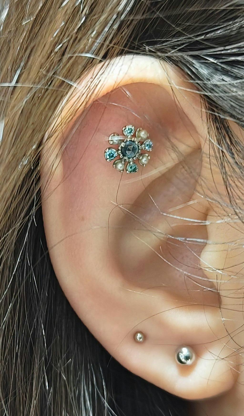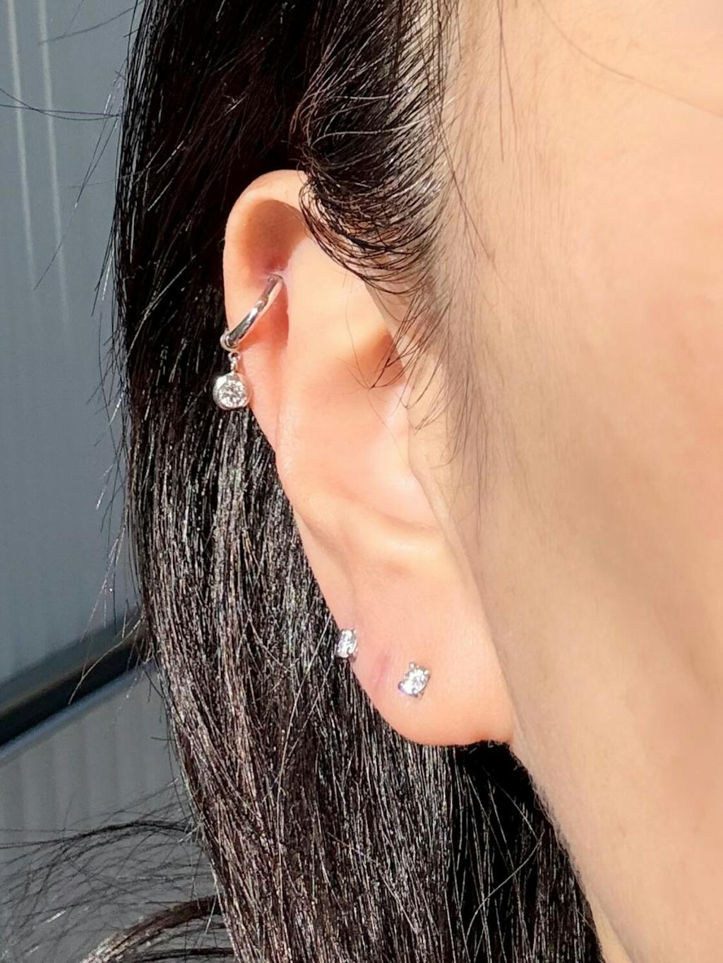 アウターコンクに目立つパーツを着ける時には、ロブをシンプルなボールで決めることが多いです。それがまた本物だからこその輝きと美しさがあり、物凄く映えます。4ミリの上のボールは2ミリ。サイズ感の違いもバランス良く収まり可愛いです。