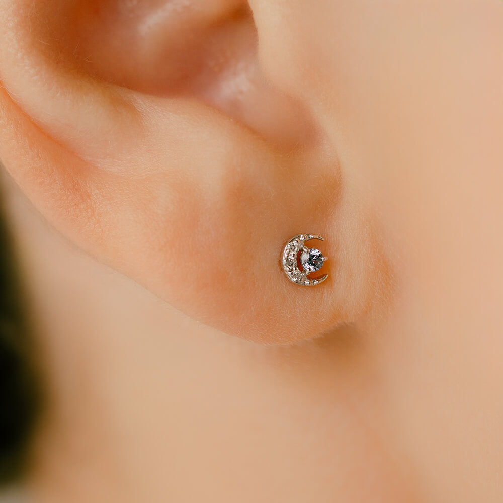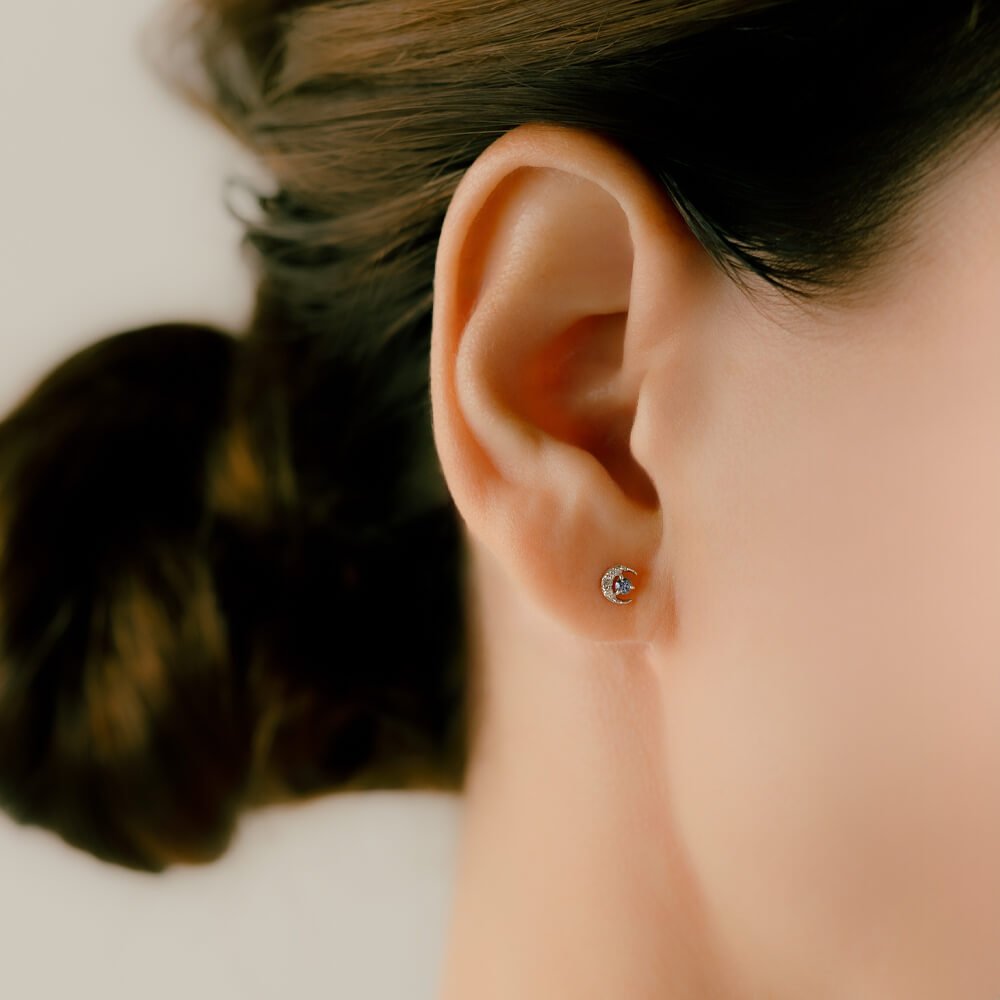 Tanzanite gleams at the center of a crescent moon. Its pale purplish-blue glow evokes the nights of Tanzania (Tanzanite) in a beautiful design.