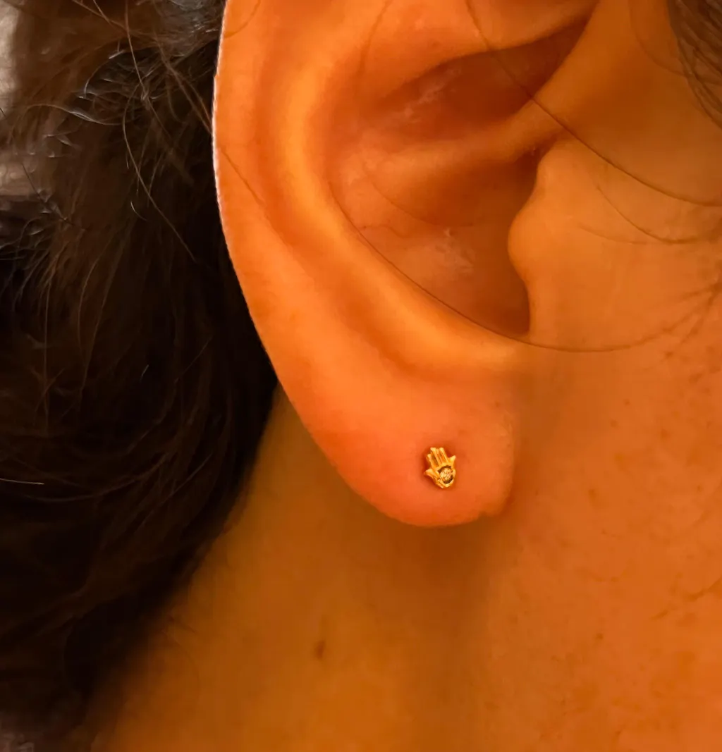 「ハムサ・ファティマの手」中東・アフリカで、邪視から身を守るお守りとして愛されるモチーフ。トラガスなど狭い部位にも使いやすい、小振りのサイズ感でお楽しみください。
